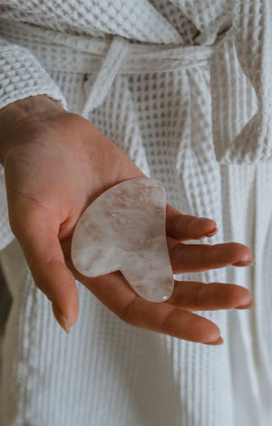 Le gua sha s’applique idéalement après une huile ou une crème afin qu’il puisse facilement glisser sur la peau. La forme particulière du gua sha lui permet d’accéder à toutes les parties du visage.